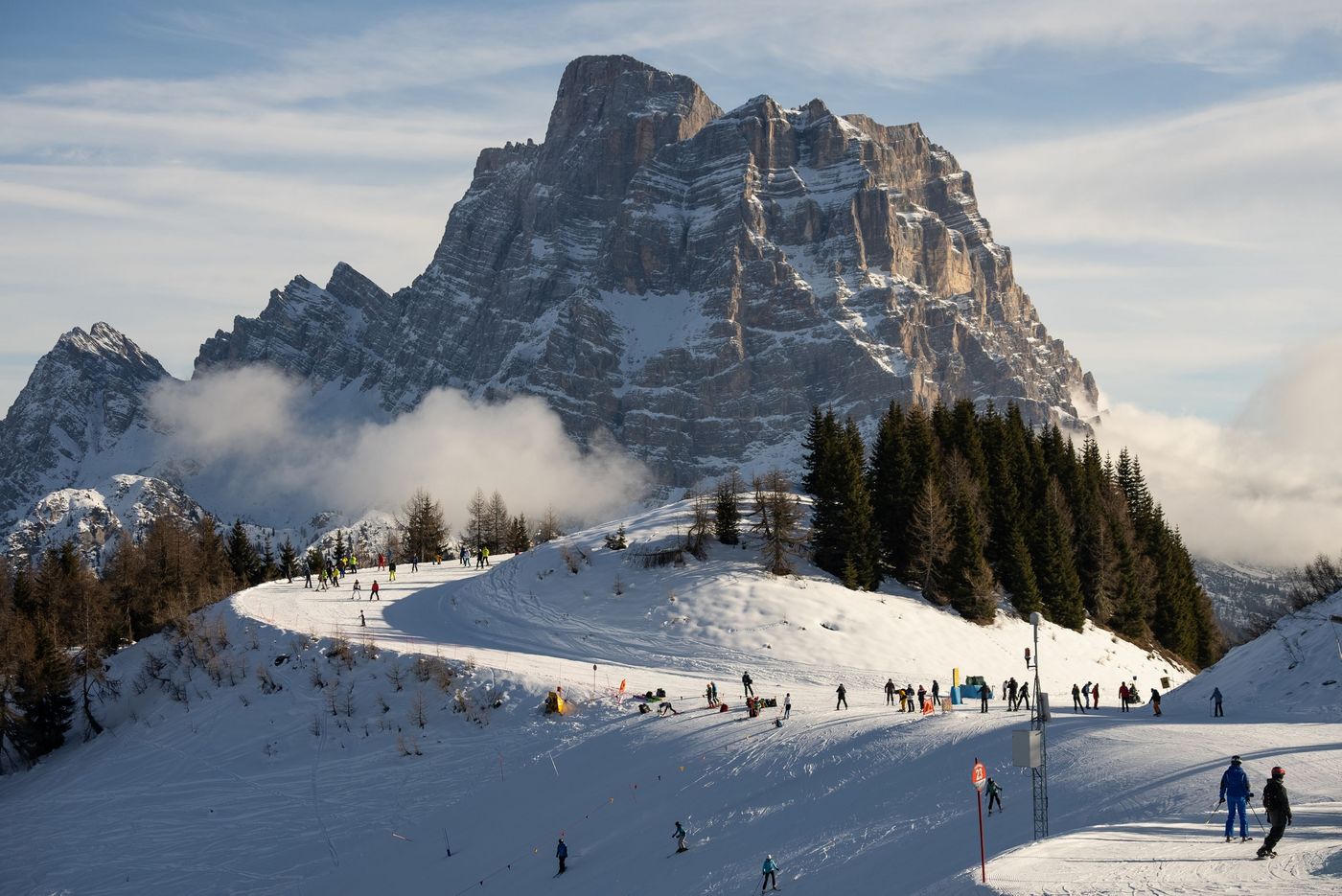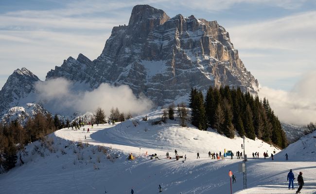 Blick auf die Pisten im Skigebiet Civetta und den 3168 m hohen Monte Pelmo.