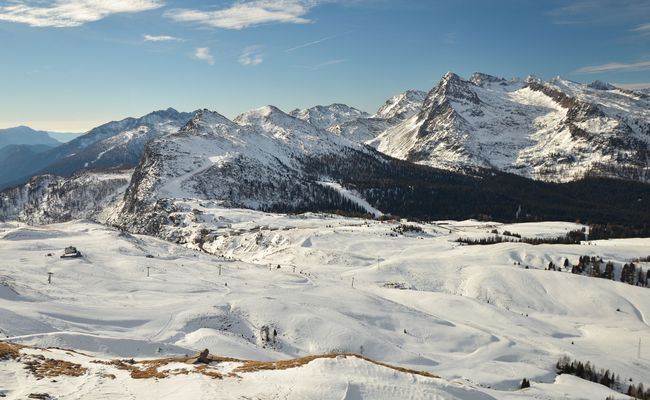 Schöner Rundumblick am Punta Ces auf 2228 m Höhe im Skigebiet San Martino di Castrozza.